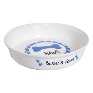 If you're looking for some great gifts for dogs, then look no further than this adorable dog bowl. This personalised dog gift gives you the option of personalising your own amazint dog food or water bowl. This white ceramic pet bowl is suitable for smaller dogs and shows a cute blue bone and paw-print design, with the word 'Woof!' at the bottom of the bowl.You can personalise the side of this gorgeous dog dish with the name of your canine chum, up to 15 characters (including spaces and apostrophes). This will then be followed by either 'Food' or 'Water' - please enter your selection in the personalisation box above. So if you're after some unique ceramic dog bowls, either for your own best friend or as a present for someone else's doggy pal, then why not treat them to one of these gorgeous Personalised Dog Bowls!